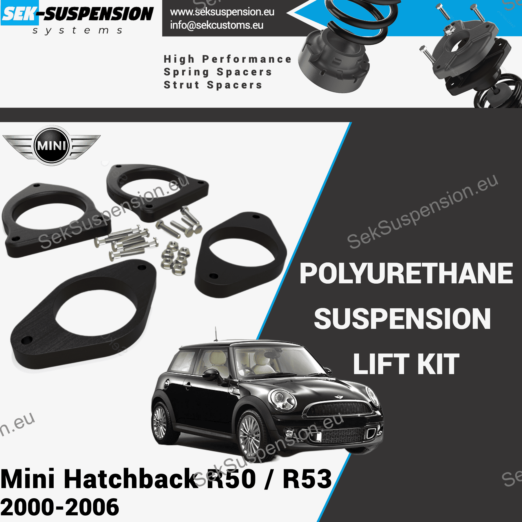 WANT TO LIFT YOUR MINI COOPER BUT NOT SURE WHERE TO START? NEED EXTRA GROUND CLEARANCE WITHOUT CHANGING MAJOR SUSPENSION PARTS? POLYURETHANE SPRING AND SHOCK ABSORBER SPACERS OFFER THE IDEAL SOLUTION FOR YOUR VEHICLE.
