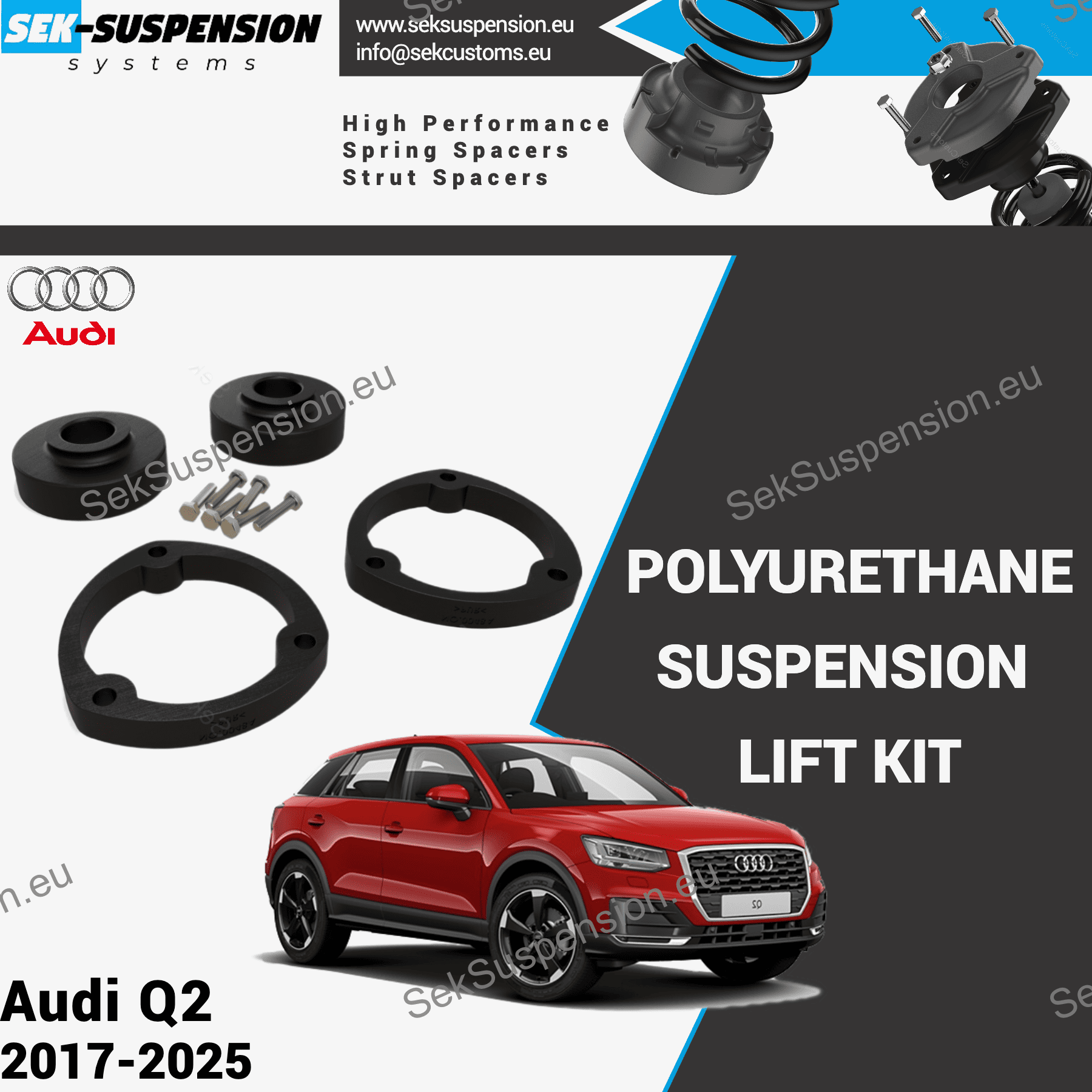 LOOKING TO LIFT YOUR AUDI BUT DON’T KNOW WHERE TO BEGIN? WANT ADDED GROUND CLEARANCE WITHOUT REPLACING MAJOR SUSPENSION COMPONENTS? POLYURETHANE SPRING AND SHOCK SPACERS PROVIDE A SIMPLE AND EFFECTIVE SOLUTION FOR YOUR AUDI Q2.