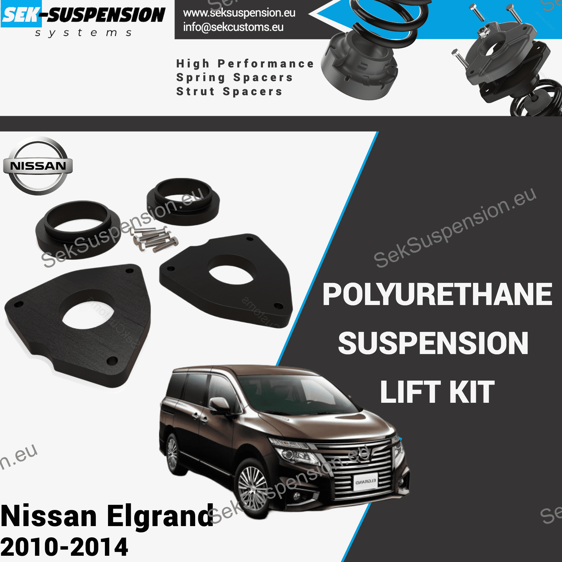 LOOKING FOR A RELIABLE WAY TO IMPROVE GROUND CLEARANCE AND GIVE YOUR ELGRANDA MORE AGGRESSIVE STANCE? POLYURETHANE SUSPENSION LIFT SPACERS OFFER A SIMPLE, AFFORDABLE SOLUTION TO ELEVATE YOUR CAR OR TRUCK WITHOUT THE NEED FOR EXPENSIVE SUSPENSION UPGRADES. PERFECT FOR BOTH DAILY DRIVING, WORK WEHICLES AND OFF-ROAD ADVENTURES.