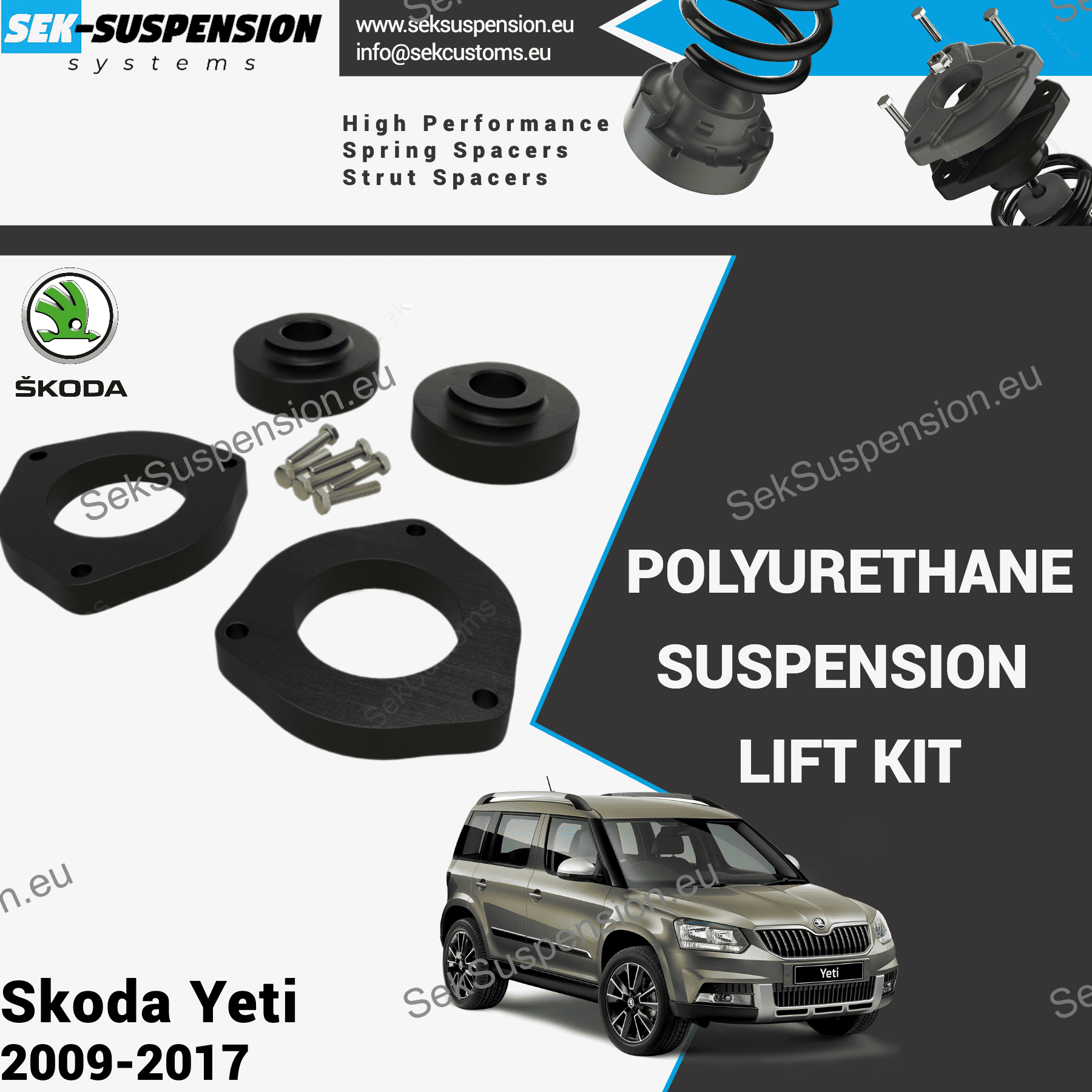 IS YOUR SKODA TOO LOW, SCRAPING THE GROUND TOO OFTEN – OR MAYBE YOU WANT TO LEVEL THE REAR WITH THE FRONT ? POLYURETHANE LIFT SPACERS, COMPLETE WITH EXTENDED BOLTS AND SHOCK EXTENDERS, OFFER A SIMPLE, AFFORDABLE, AND EFFECTIVE SOLUTION TO RAISE YOUR YETI.