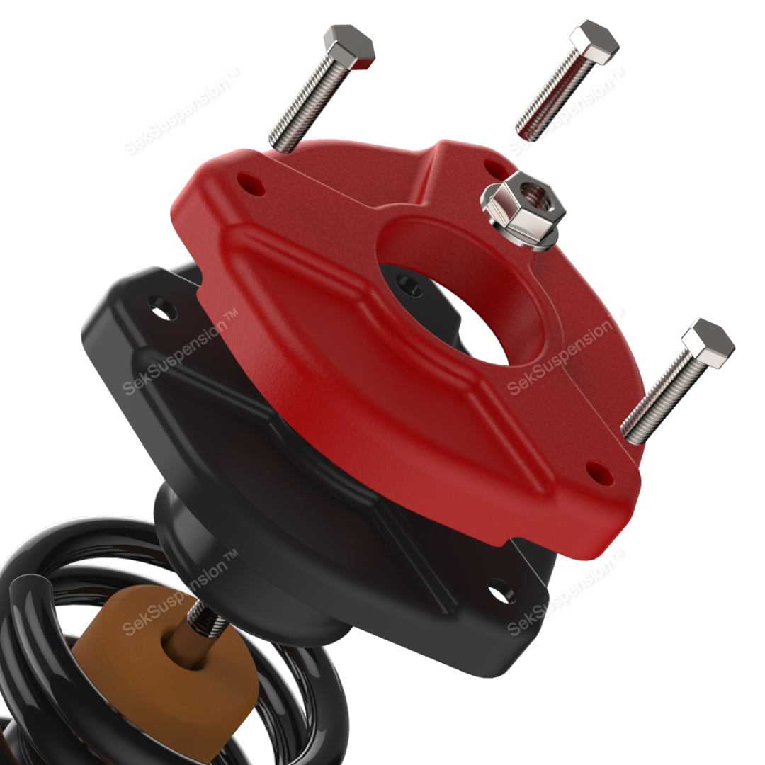 METAL MOUNTING HARDWARE : HEAVY-DUTY ZINC-COATED STEEL BOLTS, LONGER THAN THE ORIGINAL ONES, SPECIALLY MADE FOR INSTALLING SPACERS. THE SET INCLUDES CORRESPONDING NUTS AND WASHERS WHEN NEEDED.SHOCK ABSORBER EXTENSION BUSHINGS DESIGNED TO INCREASE THE SHOCK ABSORBER TRAVEL