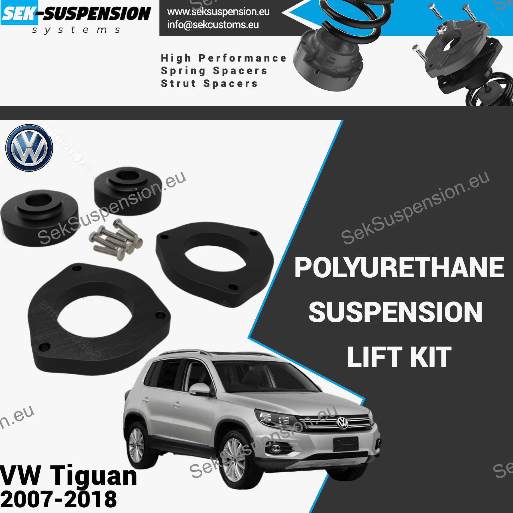 Is your Tiguan sitting too low, frequently scraping the bumper or bottoming out? Or perhaps you're looking to fit larger wheels, or want to balance the front and rear height? Maybe you're preparing for off-road adventures and need extra ground clearance? We have the perfect solution – an easy, fast, and budget-friendly way to lift your car..